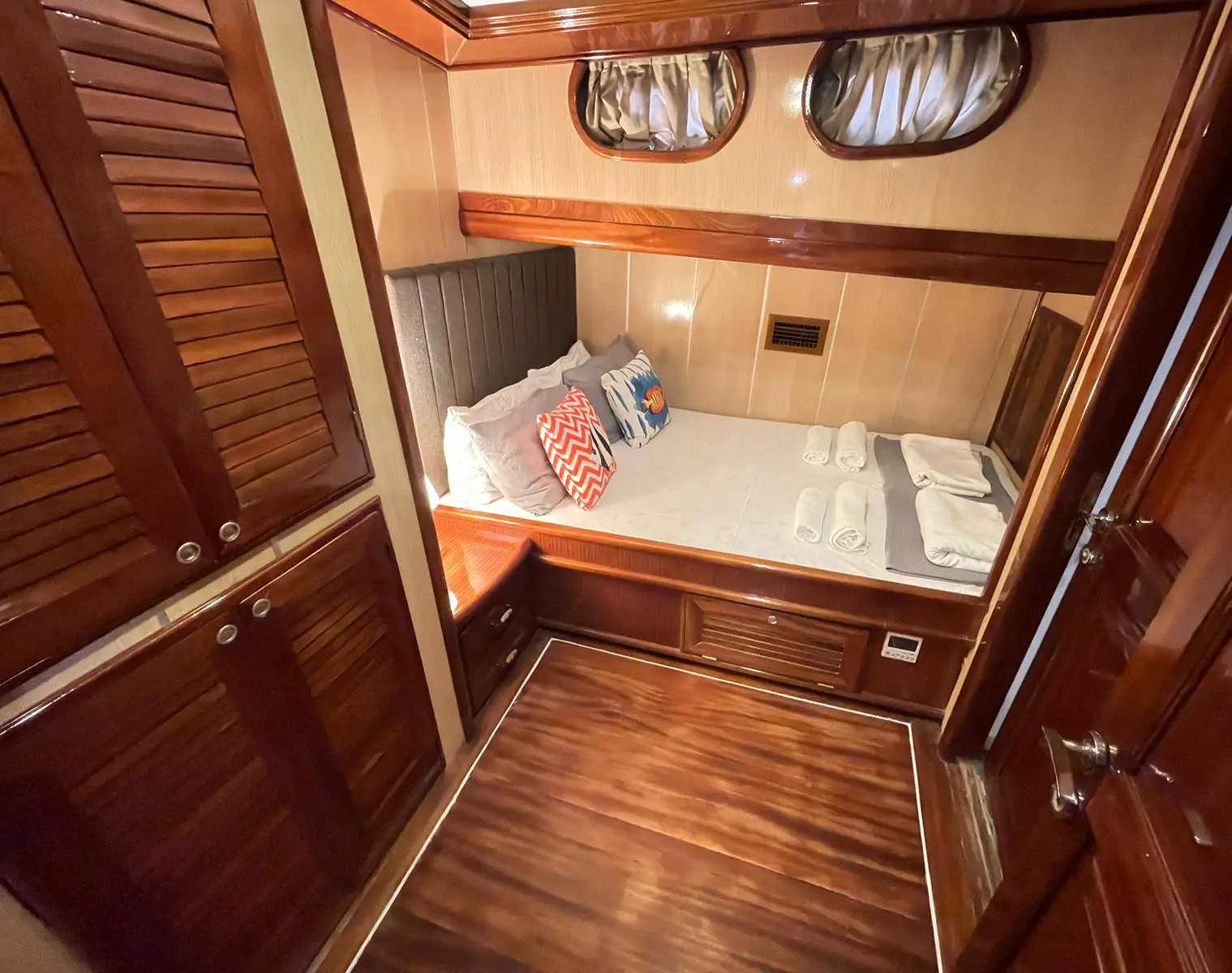 With a legal capacity of 18 guests, our gulet entered the 2025 season with fully renovated bathrooms and a jacuzzi. Thanks to its wide deck areas and bright interior spaces, it is an excellent choice for large families and groups of friends. Triple master cabins make it especially suitable for families traveling with children.