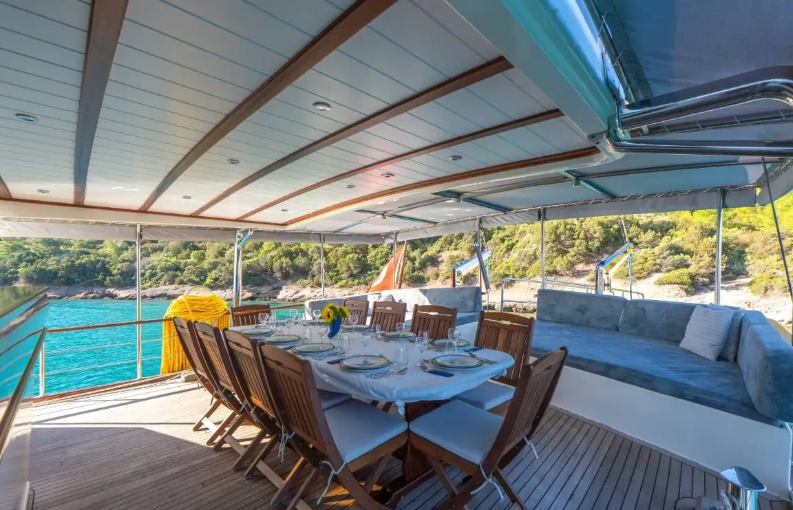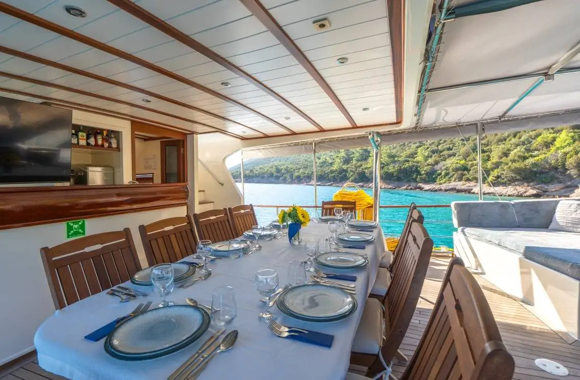 Arka güverte: Geniş yemek masası, konforlu oturma grubu ve bar alanı