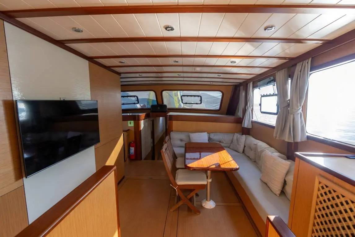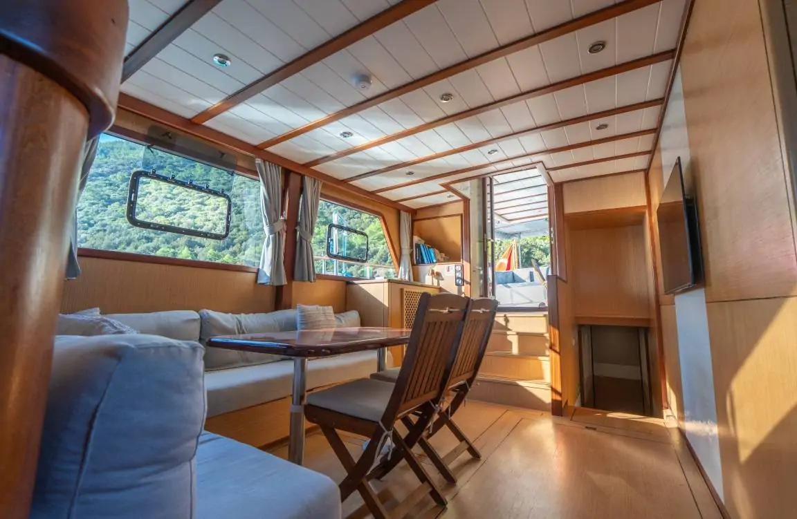 Geniş salonu ve modern iç tasarımıyla denizde ev konforu sağlar.