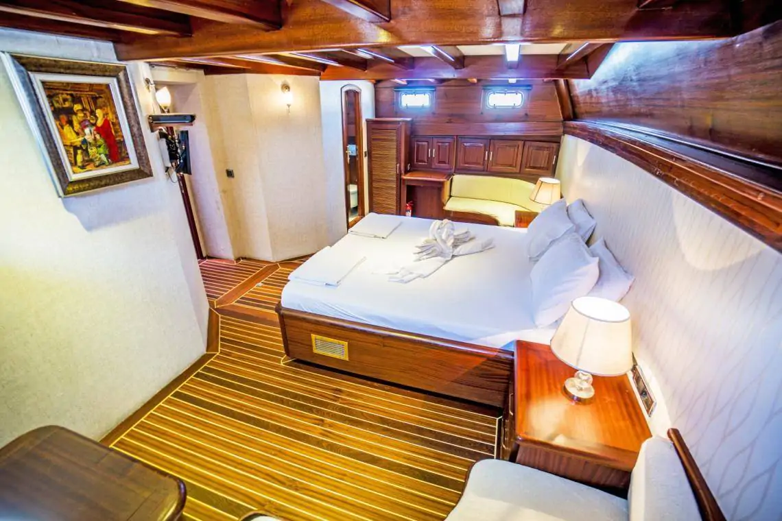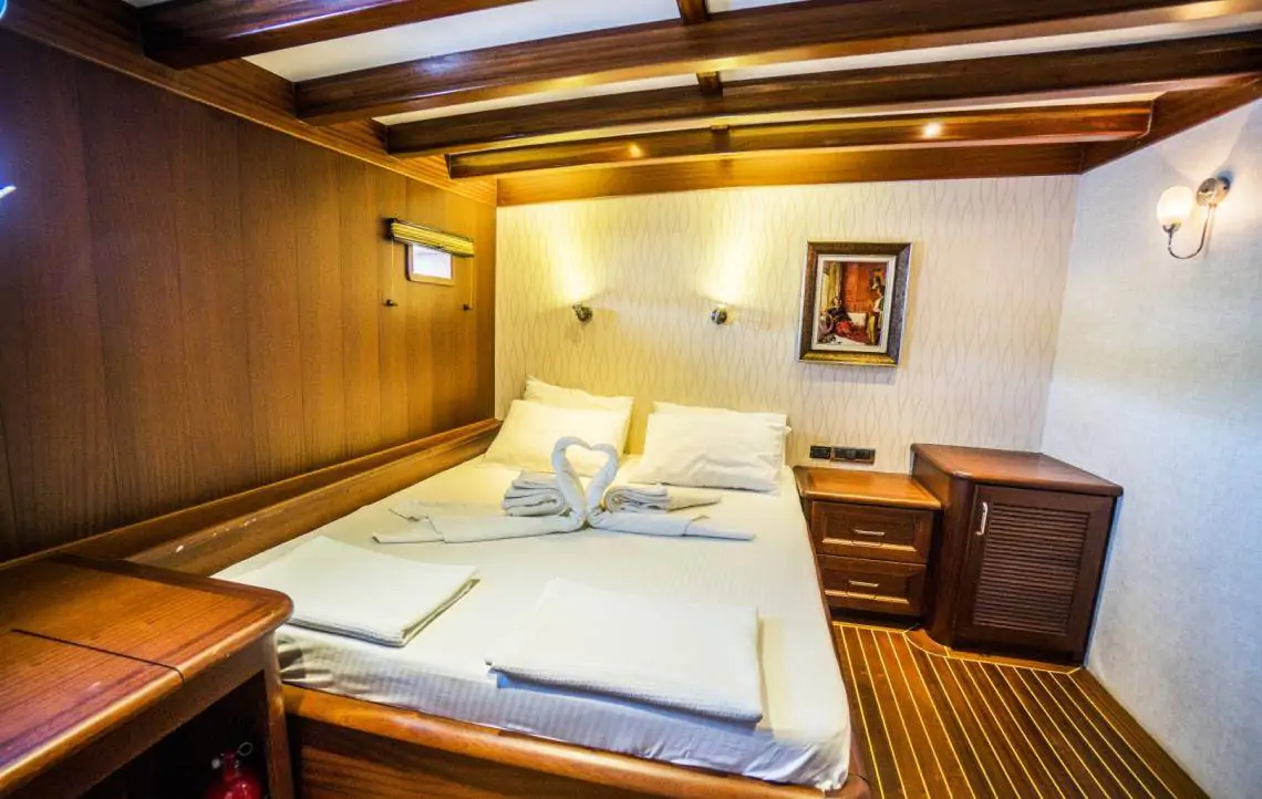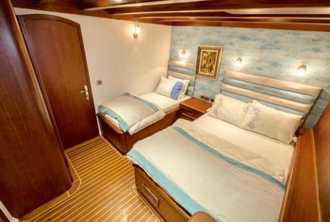 The gulet offers 6 cabins (2 master, 1 triple, and 3 double), all equipped with private bathrooms, toilets, and air conditioning.