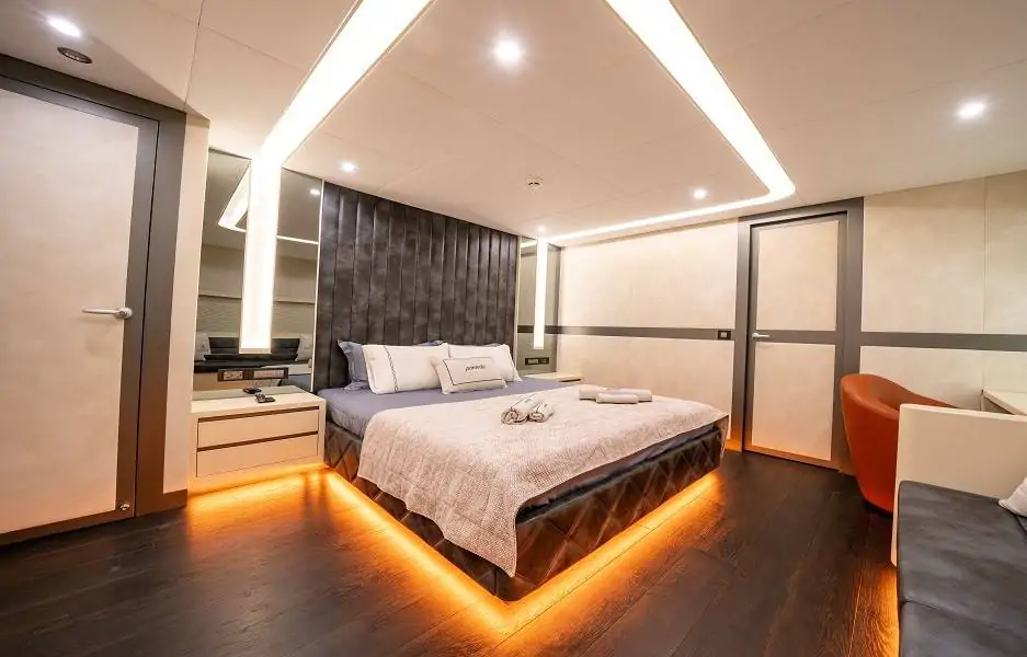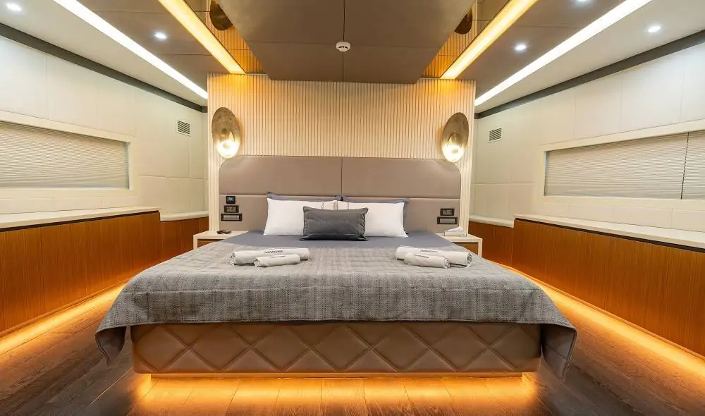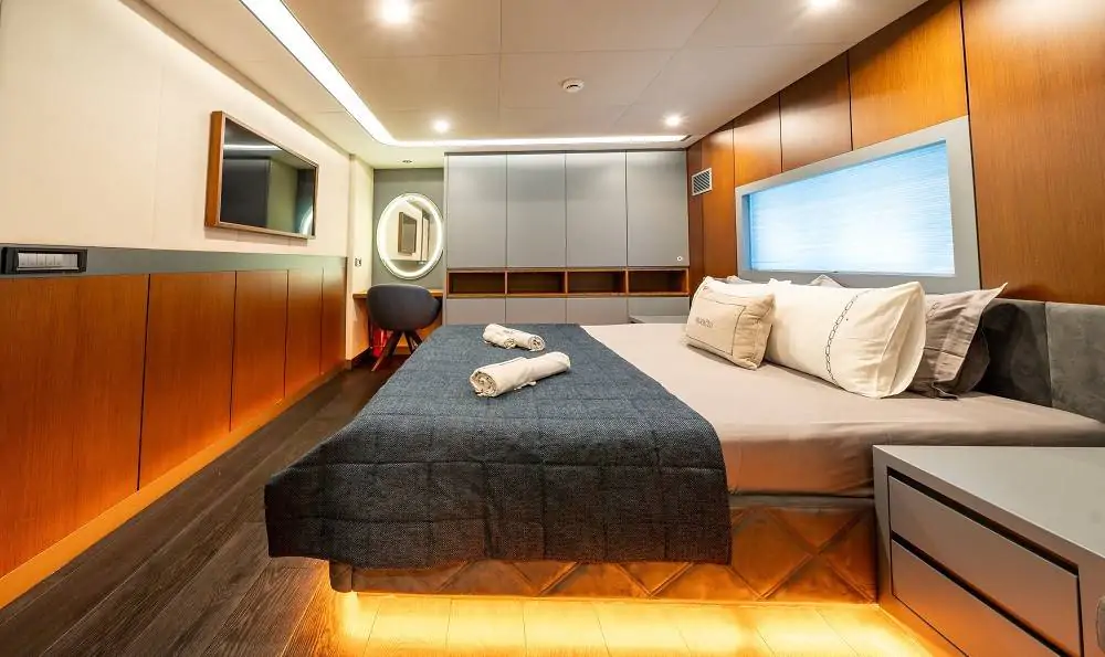 Toplam 47 metre uzunluğa sahip olan North Wind Gulet, 1 master, 3 double ve 1 twin kabin olmak üzere toplam 5 kabin ile 10 kişiye kadar konaklama kapasitesi sunmaktadır. Her kabin modern çizgilerle tasarlanmış olup; özel duş, WC, klima ve Smart TV ile donatılmıştır. Geniş ve aydınlık iç mekanlar, uzun süreli konaklamalarda maksimum konfor sağlar.