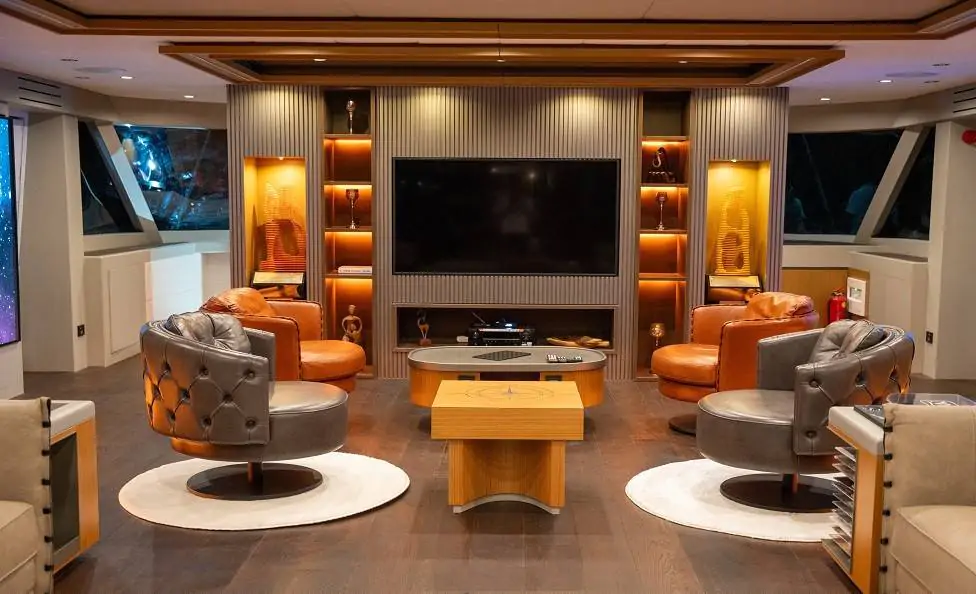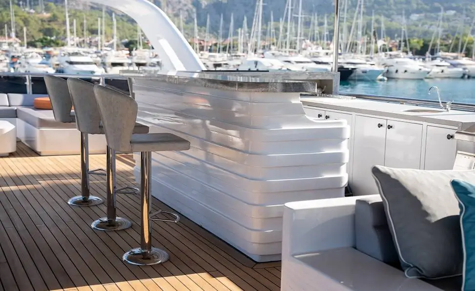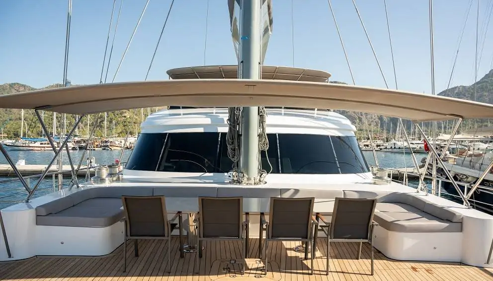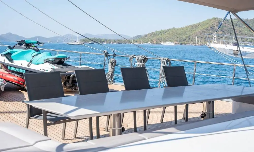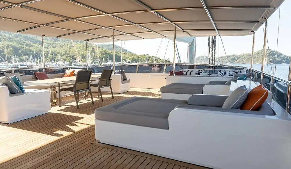Guletin öne çıkan özelliklerinden biri olan flybridge (üst güverte) alanı; panoramik manzara eşliğinde dinlenme, güneşlenme ve sosyalleşme imkânı sunar. Bu alanda yer alan bar sayesinde gün batımında içeceğinizi yudumlayabilir, denizin huzurunu doyasıya yaşayabilirsiniz. Arka güvertede bulunan geniş oturma grupları ve yemek alanı ise keyifli akşam yemekleri için ideal bir atmosfer sunmaktadır.